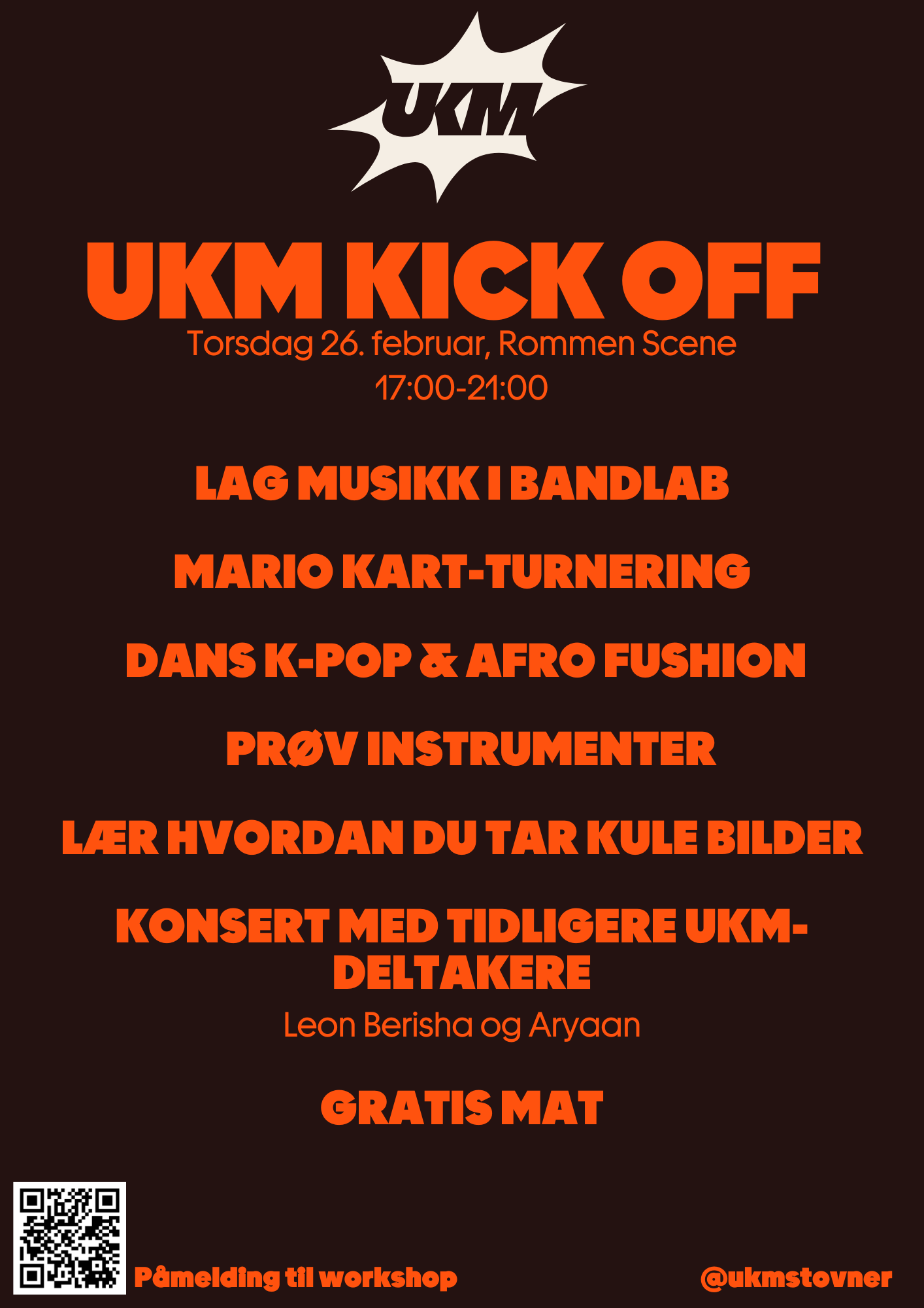 Tilbake til alle arrangementer UKM-Kick Off! torsdag 26. februar 2026 17:00 21:00 Google Calendar ICS Meld deg på workshop her!