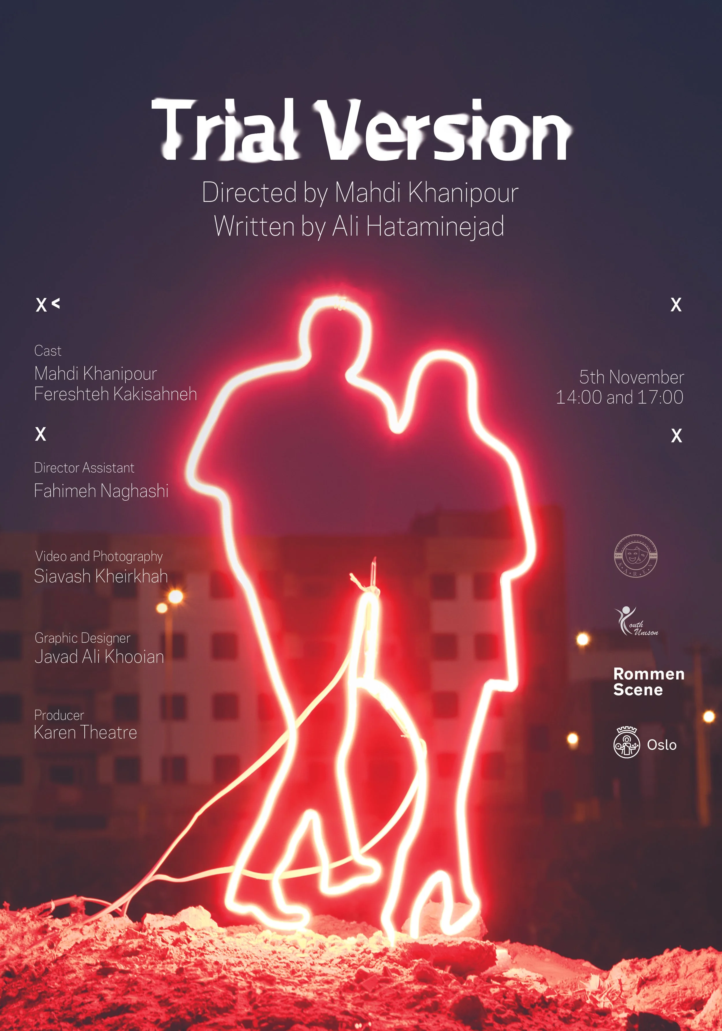 First: It all started with a picture. The picture of Pripyat city in Ukraine, a city attached to the Chernobyl Nuclear Power plant. The city that had been desolated due to the explosion of nuclear power plant and it is still empty. The pictures indicate a human catastrophe. A dynamic city which is now looks like a ghost town. The idea of writing about empty cities seemed appealing to me and became even more appealing when I thought about two people who happened to be a couple, live in such a city. A two person city; and it is not known where the others are ... in my opinion The situation and the idea were attractive, therefore the process of writing the play began in early 2017 with mentioning of this important question: “What is the reaction of the two to this action?”but the key to the adventure, is somewhere else; The key is in society and social coexistence.